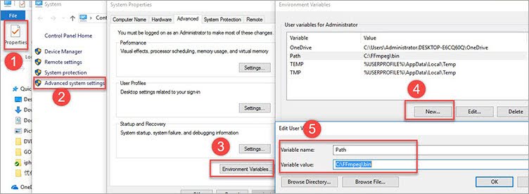 Step 1. Go to www.ffmpeg.org and download it for your device. Make a folder for the program and the files you will unpack. Then set the Environmental Variables to C:\FFmpeg\bin.