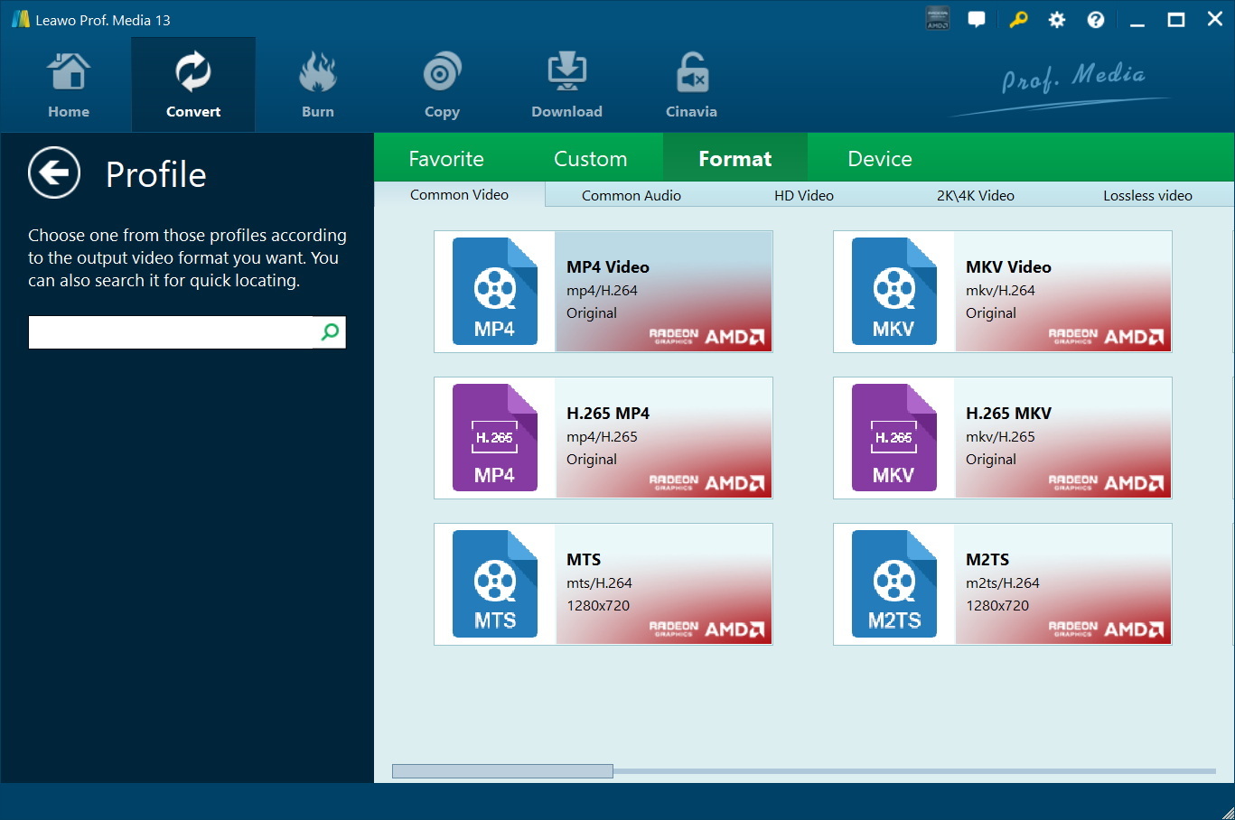 By default, the output format is set to “MP4 Video.” Here, click the drop-down arrow next to it and select “Change” to open the Profile panel. Here, you can also pick from a wide range of video and audio formats. You can select from 4K MP4 and HD AVI to device-optimized profiles for iPhone and iPad. You can choose the one that best fits your playback device or preference, then confirm your selection.